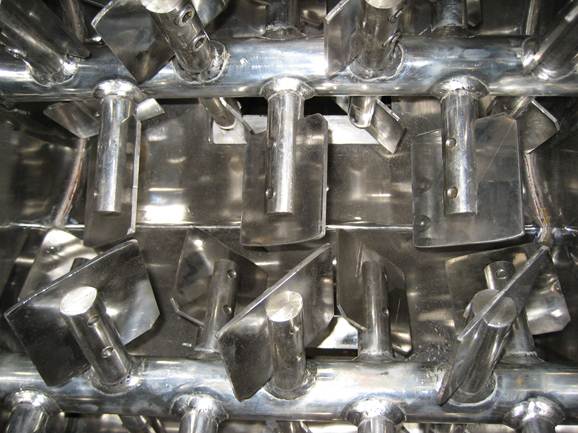 該機(jī)在w形的混合室內(nèi)裝有一對(duì)以相反方向旋轉(zhuǎn)的軸,在每個(gè)軸上安裝具有一定角度、一定數(shù)量且呈重疊狀的槳葉,在具有一定圓周速度的混合室內(nèi)形成流動(dòng)層,層內(nèi)的物料在對(duì)流混合原理的作用下進(jìn)行混合,并在瞬間處于失重狀態(tài),因而得到均勻混合物。 在容器上方亦可裝有噴液口,進(jìn)行噴加液體的固-液混合。
